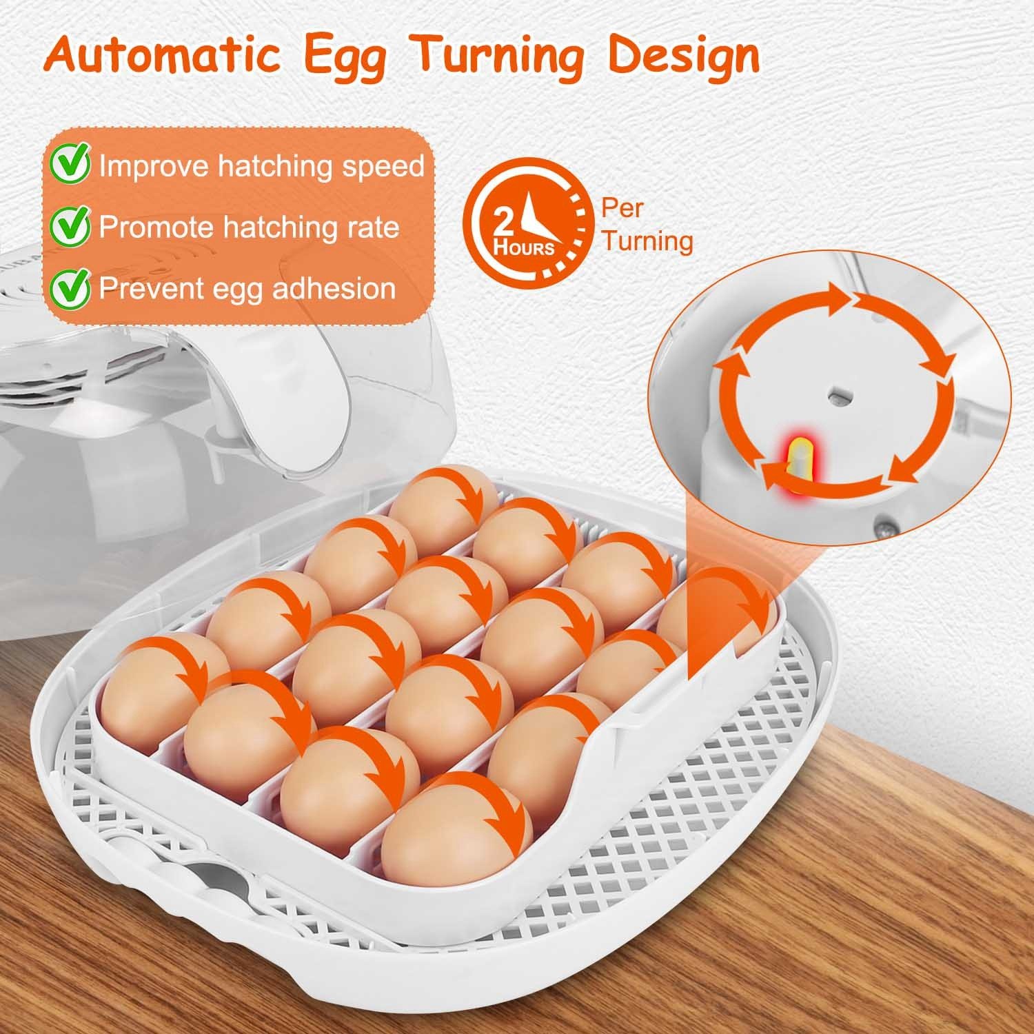 *Automatic Egg Turning*:This egg incubator will rotate the eggs automatically every 2 hours to ensure the eggs are heated evenly. Greatly improve hatching speed and hatchability,prevent eggshells from adhering to egg trays. Adopt LED check light to observe the development of eggs hatching.