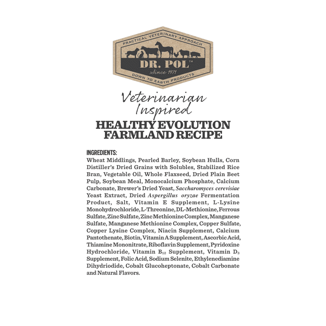 • Dr. Pol Healthy Evolution Farmland Recipe is perfectly crafted as a nutritional supplement for forage-fed Gestating/Lactating Mares and Growing Foals